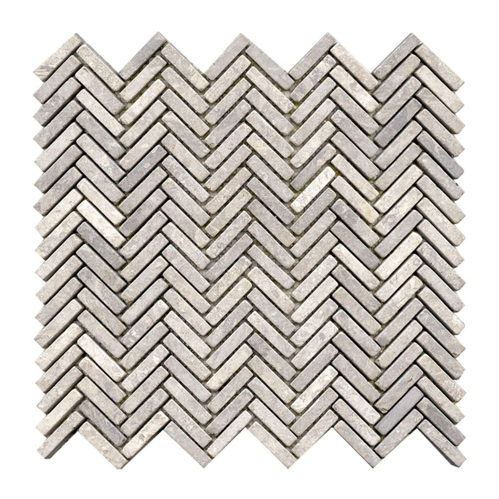 A natural stone mosaic in a herringbone pattern. These tiles are from L’Antic Colonial by Porcelanosa.