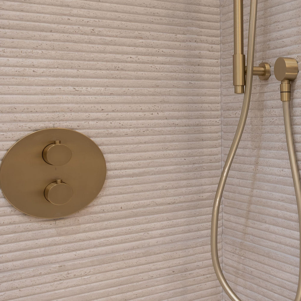 The Liberty Shower Outlet Elbow in Brushed Brass by Noken provides a sleek and functional connection between your fixed water supply and flexible shower hose.