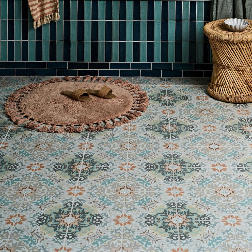 Intricate patterned tiles from the Kashmir collection by Ca'Pietra. These tiles are inspired by traditional Indian textile patterns.